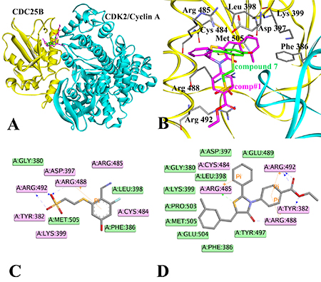 The results of receptor-ligand interactions obtained from the docking simulation were shown in Figure 3, where panel A displayed the binding pattern of the reference inhibitor compound 7 and comp#1 in the active site of CDC25B:CDK2/Cyclin A, panel B described the interactions between CDC25B and compound 7 (carbon atoms colored in green) and comp#1 (carbon atoms colored in magenta) in the active site (Phe386, D397, Leu398, K399, Cys484, R485, Arg488, Arg 492 and Met505), while panel C and D showed the 2D diagrams between CDC25B and compound 7 and comp#1, respectively.