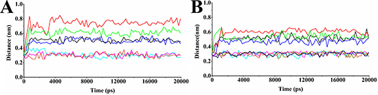 As is mentioned above, the NH1 of Arg 488 and NE of Arg 492 of CDC25B formed hydrogen bonds with the OD1 of Asp 206 of CDK2/Cyclin A and the NH1 of Arg 492 formed one hydrogen bond with the OD2 of Asp 206 and the OH of Tyr 497 of CDC25B formed one hydrogen bond with the OD1of Asp 210 in CDK2/Cyclin A. The distances of the 4 hydrogen bonds (Arg 488(N1)-Asp 206(OD1), Arg 492(NE)-Asp 206(OD1), Arg 492(N1)-Asp 206(OD2) and Tyr 497(OH)-Asp 210(OD1)) was calculated. The Figure 7 and Figure 6 displayed the change of the distances between these four pair atoms in CDC25B:CDK2/Cyclin A-comp#1 system, CDC25B:CDK2/Cyclin A-compound 7 system and CDC25B:CDK2/Cyclin A system. In un-bounded system, the mean distances of the four hydrogen bonds were about 0.31 nm, 0.30 nm, 0.31 nm, 0.29 nm, respectively. When the inhibitor bound to the receptor, the distances of the corresponding atom pairs showed higher fluctuation than un-bonded system. In bounded system, the mean distances between the four atom pairs in CDC25B:CDK2/Cyclin A (binding with comp#1) were about 0.51 nm, 0.60 nm, 0.54 nm, 0.45 nm, respectively, whereas, the average distances for them in the system of CDC25B:CDK2/Cyclin A (binding with compound 7) were 0.50 nm, 0.73 nm, 0.60 nm Å, 0.49 nm, respectively. Due to the inhibitor comp#1 or compound 7 bound to CDC25B, they formed hydrogen bonds with the key residues Arg 488 and Arg 492 and altered their conformations, hence, the distances of the four atom pairs were changed and made Arg 488, Arg 492 and Tyr 497 in CDC25B far away from their paired residues Asp 206 and Asp 210 in CDK2/Cyclin A, receptively.