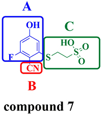 The compound 7 with the sulfate moiety attached to the 2-fluoro-4-hydroxybenzonitrile core [24] can disrupt the protein-protein interaction of CDC25B with CDK2/Cyclin A substrate and inhibit the phosphatase activity of CDC25B with weak inhibition( IC50 1 mM). It is a very good starting point for the development of more potent inhibitors through disrupting the protein-protein interactions of CDC25B with CDK2/Cyclin A substrate based on the compound 7.