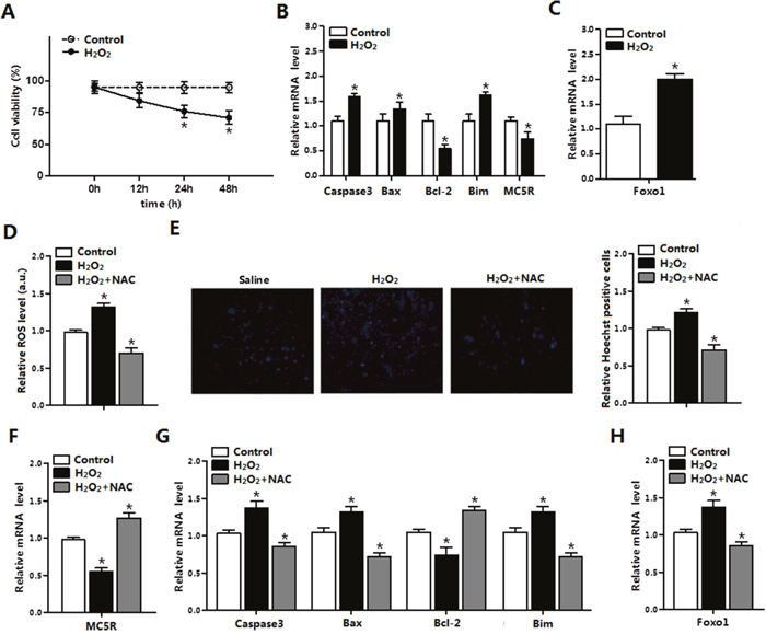 Figure 2: ROS triggered apoptosis through causing oxidative stress in adipocytes. (A) Cell viability measurement in control group and H2O2 group after treatment with H2O2 for 12 h, 24 h, 48 h (n=3). (B) The relative mRNA levels of Caspase3, Bax, Bcl-2, Bim and MC5R in the H2O2 group and control group (n=3). (C) The relative mRNA levels of Foxo1 in control group and H2O2 group (n=3). (D) The relative ROS level of cells in the control group, the H2O2 group and the H2O2 and NAC co-treatment group (n=3). (E) The relative Hoechst Positive cells in each group; Hochest staining after H2O2 and NAC treatment in primary adipocytes (n=3). (F) The relative mRNA expression of MC5R in the control group, the H2O2 group and the H2O2 and NAC co-treatment group (n=3). (G) The relative mRNA expression of Caspase3, Bax, Bcl-2 and Bim in the control group, the H2O2 group and the H2O2 and NAC co-treatment group (n=3). (H) The relative mRNA expression of Foxo1 in the control group, the H2O2 group and the H2O2 and NAC co-treatment group (n=3). Values are means ± SD. vs. Control group, *p < 0.05.