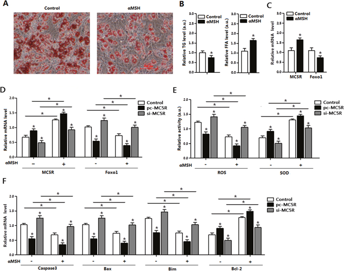 Figure 3: αMSH and MC5R inhibited oxidative stress, apoptosis and Foxo1 expression in mice adipocytes. (A) Images of adipocytes stained by Oil Red O staining after treatment of αMSH on differentiation until 6 day (n=6). (B) Relative TG level and FFA level after treatment of αMSH on differentiation until 6 day (n=6). (C) Relative mRNA levels of MC5R and Foxo1 in the control group and αMSH treatment group (n=6). (D) The mRNA expression of MC5R and Foxo1 after transfection with control vector, pc-MC5R and si-MC5R (n=6). (E) The relative activity of ROS and SOD after transfection with control vector, pc-MC5R and si-MC5R (n=6). (F) The mRNA expression of Caspase3, Bax, Bim, and Bcl-2 after transfection with control vector, pc-MC5R and si-MC5R (n=6). pc-MC5R: MC5R overexpression vector; si-MC5R: MC5R shRNA vector; Control: pcDNA 3.1 vector. Values are means ± SD. vs. Control group, *p < 0.05.