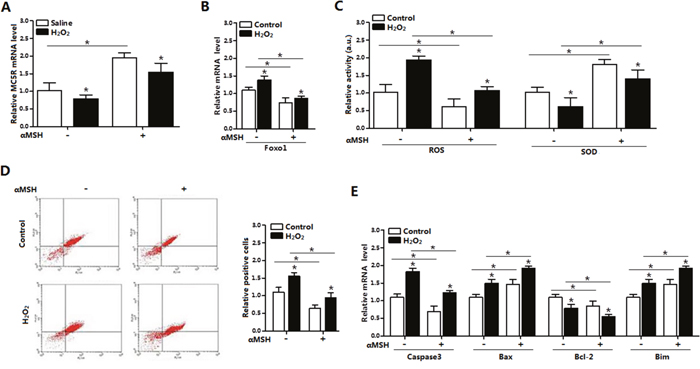 Figure 4: αMSH inhibited ROS-induced apoptosis and reduced Foxo1 expression in mice adipocytes. (A) The relative MC5R mRNA level of adipocytes with treatment of αMSH after incubated for 24 h in the presence of H2O2 (n=3). (B) The relative Foxo1 mRNA level of adipocytes with treatment of αMSH after incubated for 24 h in the presence of H2O2 (n=3). (C) The relative activity of ROS and SOD in adipocytes treatment of αMSH after incubated for 24 h in the presence of H2O2 (n=3). (D) Annexin V-FITC/PI staining of apoptosis by flow cytometry analysis (n=3). (E) The relative mRNA level of Caspase3, Bax, Bcl-2 and Bim of adipocytes with treatment of αMSH after incubated for 24 h in the presence of H2O2 (n=3). Values are means ± SD. vs. Control group, *p < 0.05.