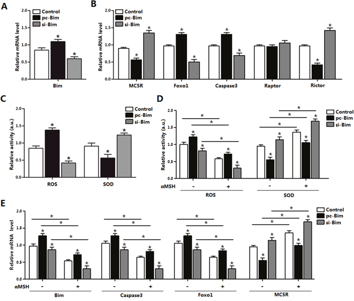 Figure 6: αMSH inhibited apoptosis through reducing Bim and Foxo1 expression. (A) Bim transfection efficiency detection in Control group, pc-Bim group and sh-Bim group after 48 h transfection (n=3). (B) Relative mRNA level of MC5R, Foxo1, Caspase3, Raptor and Rictor in Control group, pc-Bim group and sh-Bim group after 48h transfection (n=3). (C) Relative activity of ROS and SOD in Control group, pc-Bim group and sh-Bim group after 48 h transfection (n=3). (D) Relative activities of ROS and SOD in Control group, pc-Bim group and sh-Bim group after 48 h transfection under treatment of αMSH (n=3). (E) Relative mRNA levels of Bim, Caspase3, Foxo1 and MC5R in Control group, pc-Bim group and sh-Bim group after 48 h transfection under treatment of αMSH (n=3). pc-Bim: Bim overexpression vector; si-Bim: Bim shRNA vector; Control: pcDNA 3.1 vector. Values are means ± SD. vs. Control group, *p < 0.05.
