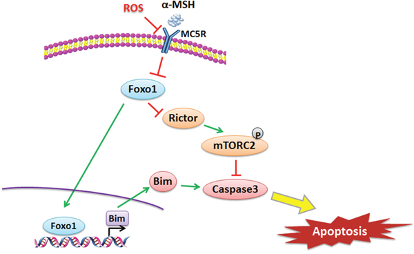 Figure 8: αMSH inhibited apoptosis induced by ROS via Foxo1/mTORC2 signal. αMSH reduced Foxo1 through MC5R, then down-regulated Bim and up-regulated Rictor, which inhibited apoptosis via mTORC2. Foxo1 is a transcriptional activator of Bim and can aggravate ROS-induced apoptosis by binding to Bim promoter region in adipocytes.