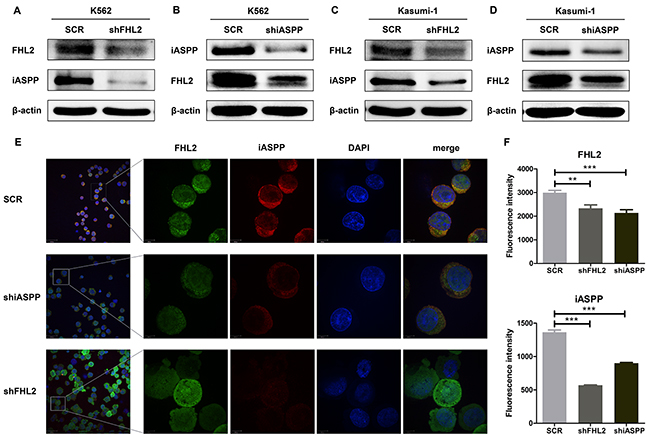 Figure 5: The correlation between the expression level of FHL2 and iASPP. (A, C) The expression level of iASPP was detected when FHL2 was knocked down in K562 and Kasumi-1 cells; (B, D) the expression level of FHL2 was assessed after iASPP knockdown in K562 and Kasumi-1 cells. Western blots were performed using indicated antibodies. (E) Immunofluorescence analysis was performed to detect the fluorescence intensity of FHL2 and iASPP after iASPP or FHL2 knockdown in K562 cells. Anti-FHL2 and anti-iASPP antibodies were used as primary antibodies, and DAPI was used for nuclear staining. Bars represent 8 μm. (F) Representative histograms of fluorescence intensity are displayed, data represent ten positive cells (**P<0.01, ***P<0.001).