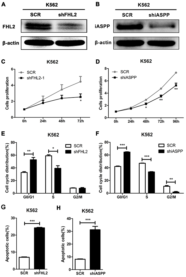 Figure 3: Silence of FHL2 or iASPP in K562 cells reduces cell proliferation, induces cell cycle arrest at G0/G1 phase, and increases cell apoptosis. (A, B) After infected with lentivirus of shFHL2 or shiASPP for 72 hours in K562 cells, the expression level of FHL2 or iASPP was measured by Western blot. β-actin was used as an internal control. (C, D) MTT assays were used to assess cell proliferation ability after 24 hours of lentivivus infection in K562 cells. (E, F) Cell cycles of K562 cells with FHL2 or iASPP knockdown were analyzed by flow cytometry after PI staining. (G, H) Cell apoptosis was analyzed in K562 cells after FHL2 or iASPP knockdown by flow cytometry using Annexin-V/PI staining. Data represents there independent experiments (*P<0.05, **P<0.01, ***P<0.001). SCR, cramble sequence.