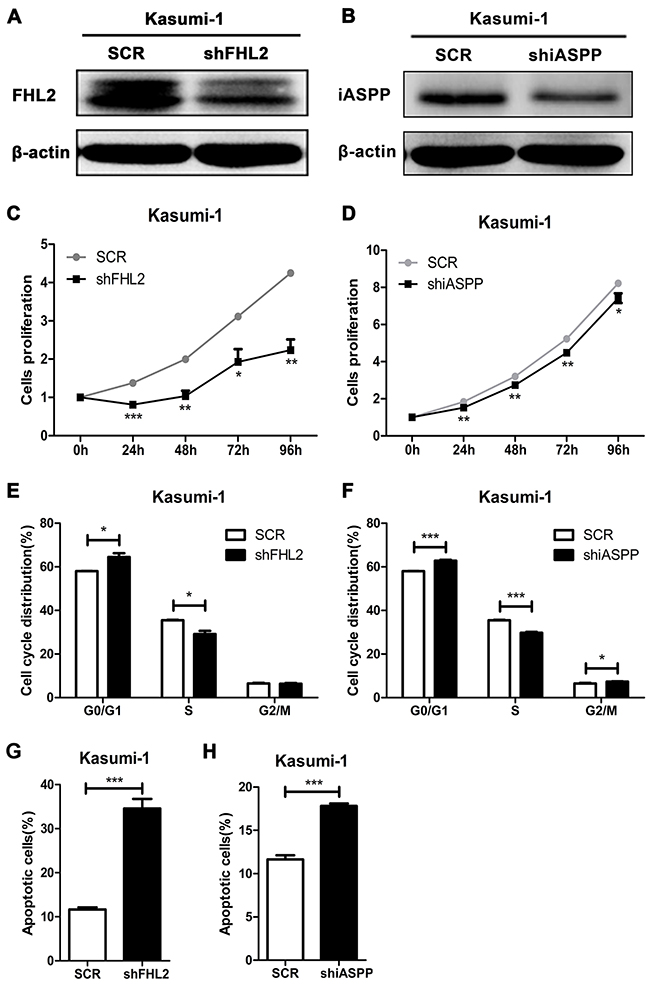 Figure 4: FHL2 or iASPP knockdown in Kasumi-1 cells inhibits cell growth, increases the percentage of cells in G0/G1 phase and cell apoptosis. (A, B) Western blot was performed to examine the expression level of FHL2 or iASPP in Kasumi-1 cells after FHL2 or iASPP silencing for 96 hours. (C, D) Cell growth of Kasumi-1 cells with FHL2 or iASPP knockdown was measured by MTT assays. (E, F) Flow cytometry was used to analyze cell cycle of Kasumi-1 cells when FHL2 or iASPP was knocked down. (G, H) After Annexin-V/PI staining, cell apoptosis was analyzed by flow cytometry in Kasumi-1 cells with FHL2 or iASPP knockdown. Data represent there independent experiments (*P<0.05, **P<0.01, ***P<0.001).