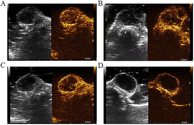 Figure 3: Serial CEUS images before and after irradiation. (A) CEUS images before HIFU irradiation. CEUS revealed contrast agent perfusion at the periphery of the tumors, as well as irregular contrast agent non-perfused areas within the tumors. (B) CEUS images at 24 hours after HIFU irradiation. CEUS revealed contrast agent perfusion at the periphery of the tumors. (C) CEUS images at 48 hours after HIFU irradiation. The CEUS results were like those of the 24-hours group, with irregular contrast agent non-perfused areas within the tumors and contrast agent perfusion in the tumor periphery. (D) CEUS images at 2 weeks after HIFU irradiation. CEUS revealed the peripheral contrast agent perfusion area was increased compared with the 24-hours and 48-hours groups.