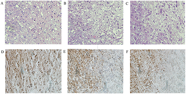 Figure 4: Histopathologic analysis in Group B at different times after HIFU irradiation. Necrotic areas were identified by use of hematoxylin and eosin (H&E) staining under a high-power field (×400) (A, B, and C). Apoptotic cells were quantified using the TUNEL assay (×400) (D, E, and F). There were significant differences of apoptosis and necrotic areas of the tumor between different times after HIFU irradiation.