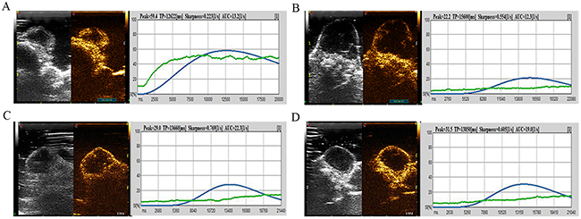 Figure 5: CEUS image and DCE-US time-intensity curves of one mouse in Group B at different times before and after irradiation. (A) The CEUS image and DCE-US perfusion parameters before HIFU irradiation. (B) The CEUS image and the intensity of ultrasonic image changing over time at 24 hours after HIFU irradiation. (C) Perfusion parameters at 48 hours after HIFU irradiation. (D) Time-intensity curve at 2 weeks after HIFU irradiation.