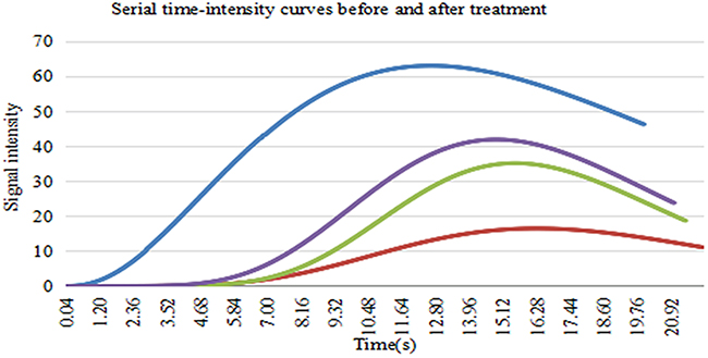 As shown in this study, HIFU (Group C, 65°C-80° C) and sub-threshold HIFU (Group B, 55°C-60° C) inhibits tumor growth. Three tumors in Group C disappeared, with seven mice skin burned. In Group B, all tumors showed inhibited growth, with no mice skin burned. The US perfusion parameters, including PI and AUC, had decreased significantly 24 hours after irradiation (P <0.05) in Group B. TP and sharpness had increased significantly 24 hours after irradiation because the tumor was ablated and the volume of the tumor was reduced. At the late phases of irradiation, PI and AUC increased and TP decreased at 48 hours and 2 weeks after irradiation compared with 24 hours because the tumor had grown larger and microvascular increased. As shown in Figure 6, the red line with the lowest PI and longest TP at 24 hours after HIFU irradiation might reflect the best efficiency of sub-threshold HIFU radiation. Because of the tumor growth and blood vessel density inside the tumor increased, green line and the purple line are both above the red line. These results suggest that the US perfusion parameters are useful for predicting the therapeutic response after irradiation.