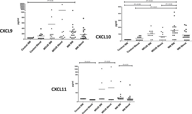 All three chemokines were expressed at low levels in the control group. However, it was noteworthy that CXCL9 and CXCL10 were undetectable within the bone marrow whereas low levels were observed within blood. This indicates that the expression of these inflammatory chemokines is normally under tight regulation within the marrow compartment.