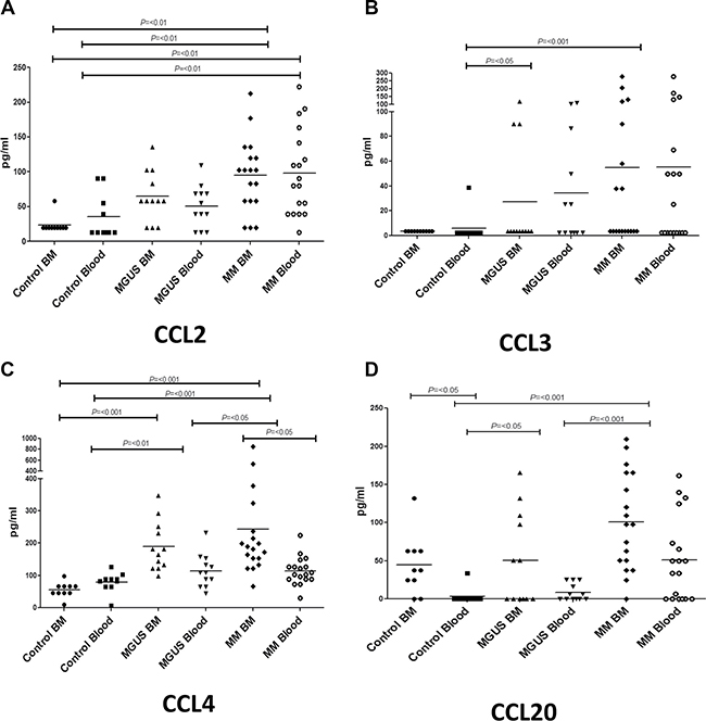 Within healthy controls the concentration of all the chemokines was found to be low and broadly similar between the blood and marrow compartments. Specifically, CCL2 and CCL3 were undetectable in marrow with very low levels being found within blood. CCL4 was measurable at low level in both marrow and blood whereas CCL20 was found at slightly higher level within the marrow and was not detectable in blood.