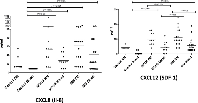 The C-X-C chemokines CXCL12 and CXCL8 are also progressively increased in blood and BM in patients with MGUS and MM