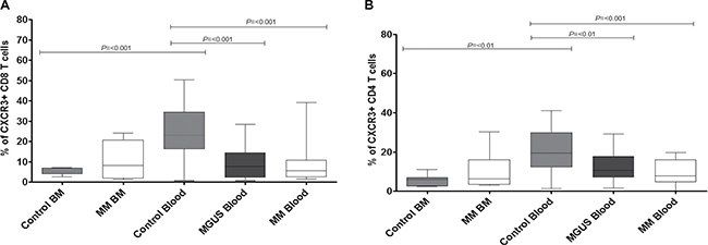 The pattern of distribution of CXCR3+ T cells between blood and bone marrow is altered in patients with multiple myeloma