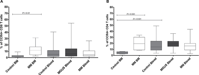 The expression of CCR4 is markedly increased on CD8 and CD4 T cells within the bone marrow of patients with myeloma