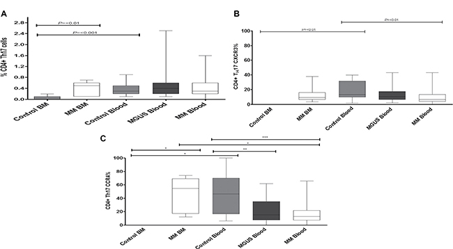 Figure 6: The frequency of CD4+ TH17 cells (A) was measured in both control individuals and MM and MGUS patients. The percentage expression of CXCR3 (B) and CCR4 (C) was then determined on the CD4+ TH17 cells within these compartments. Statistical analysis was by Kruskal Wallis where *** = p < 0.001, ** = p < 0.01, * p < 0.05