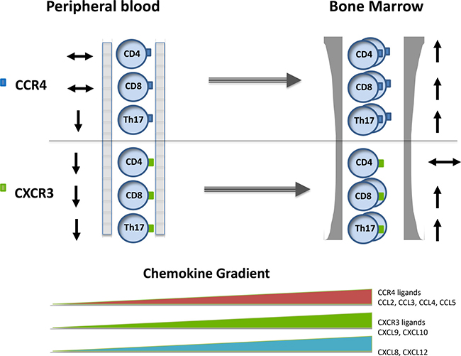 Overall it can be seen that T cells which express CCR4 or CXCR3 are strongly excluded from bone marrow within healthy individuals, whereas in the patient group this pattern is lost and a relative equivalence between compartments is observed due to an increased proportion of cells within marrow and fewer cells retained with peripheral blood.