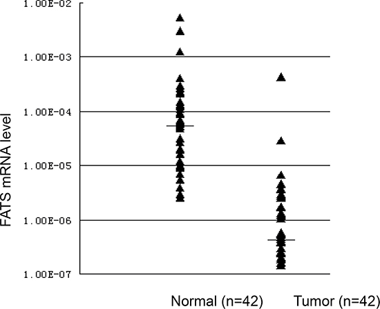 Previous data have shown that FATS is a tumor suppressor at the genomic region susceptible to DNA damage induced by radiation or replication stress [8]. Because FATS is expressed in mammary gland but extensively silent or downregulated in mouse tumors [7], it can be expected that its expression might also be altered in human breast cancer. To test this hypothesis, we analyzed FATS expression in paired normal and tumor tissues using quantitative reverse transcription polymerase chain reaction (qRT-PCR). Among the 42 paired breast cancers in the present analysis, 95.2% were significantly downregulated or silent (Figure 1). After normalization with a housekeeping gene expression, these alterations in FATS expression in breast tumor tissues were confirmed. In contrast to the median level of FATS mRNA (5.56E-05) in normal breast tissues, the average level of FATS expression (5.01E-07) in paired breast tumors was 100-fold decreased (Figure 1), strongly indicating the low expression of FATS in human cancer.