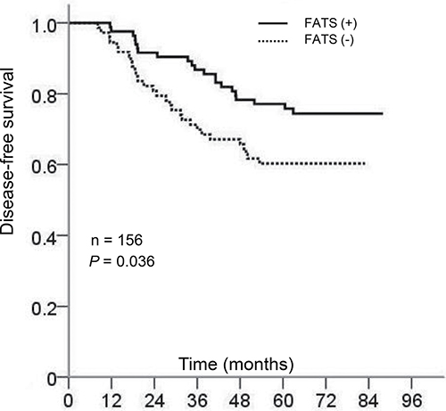 Figure 3: (A) Kaplan-Meier curves of survival probability for patients with the treatment of adjuvant radiotherapy (RT) in relation to FATS status. P = .006 (n = 81). (B) Kaplan-Meier curves of survival probability for patients without the treatment of adjuvant radiotherapy (RT) in relation to FATS status. P = .867 (n = 75).