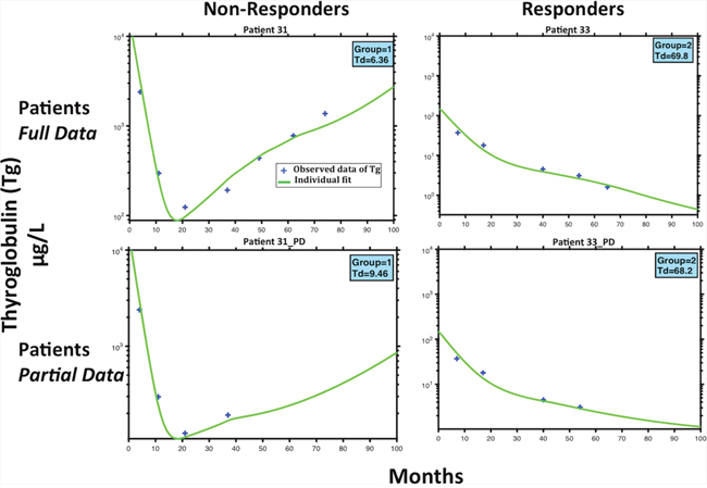 Figure 4 shows that with using only partial data for Tg, the model was still able to classify the patients accordingly. This dynamic is showed under Patient(s) 31,33 _(PD). Regarding patient 31, the model predicts their status as a non-responder depending on an estimation of their as 6.36 months, which is a relatively short doubling time in the setting of thyroid cancer. The status was also accurately predicted with the first 4 stimulated Tg-values ( of 9.46 months) (Figure 4). Similarly, patient 33 was classified as a responder with estimation of the of 69.8 and 68.2 months, with respectively 5 or 4 stimulated Tg-values (Figure 4). These two patients provide evidence that the status could be predicted with the first stimulated-Tg values.
