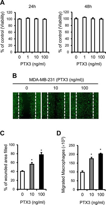 Figure 3: PTX3 enhances breast cancer cell migration and macrophages migration to cancer cells. A: Analysis of the effect of PTX3 on cell proliferation in MDA-MB-231 cells. MDA-MB-231 cells were treated with indicated concentrations of PTX3 and proliferative effects of PTX3 on these cells were determined with CCK-8 assay after 24 and 48 hours. B: Migration scratch assay to investigate the migration potential of MDA-MB-231 cells after treatment with PTX3. Cells were treated with various concentrations of PTX3 (0, 10, 100 ng/ml) and imaged after wound scratching. The dashed lines indicate the lines of the initial wound boundary. C: Wound closure effect was calculated as wound confluence gained in 24 hours. D: Involvement of PTX3 in the migration of macrophages. Recombinant PTX3 proteins (0, 10, and 100 ng/ml) was pretreated for 1 hour to MDA-MB-231 cells at the lower compartments of a transwell system and macrophages (1.2 × 106) were added to the upper chamber of each transwell. Cells were allowed to migrate for 6 hours and the number of macrophages in the lower chamber was counted. Bars indicate the mean and standard deviation (SD) of the numbers of macrophages migrated to lower chamber (*P < 0.05, compared to macrophages with no treatment).