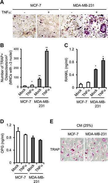 To determine the role of PTX3 in osteolysis, we utilized a co-culture system in which primary murine bone marrow cells were cultured with murine pre-osteoblasts. This co-culture system represents a simplified version of physiological bone environment, in which OB and OC can interact with each other. We cultured isolated pre-osteoblasts and bone marrow cells in the presence of Vitamin D3 and prostaglandin E2 (PEG2) at the lower compartments of a transwell system. MCF-7 or MDA-MB-231 cells treated with control solution or TNFα were added to the upper chamber of each transwell to supply PTX3 to lower chamber. The number of tartrate-resistant acid phosphatase (TRAP)-positive multinucleated cells (TRAP+MNCs), i.e., OC formation, resulting from control-treated MDA-MB-231 cells was approximately eight-fold higher than that of MCF-7 (Figure 4A, B). TNF-α treatment further increased OC formation approximately four-fold in MDA-MB-231 cells (P < 0.005) compared to the mock (Figure 4B). Because PTX3 did not stimulate OC formation directly (data not shown), we surmised that PTX3 produced by MDA-MB-231 cells may stimulate RANKL production from OBs and subsequently activate OC formation. Thus, we next determined whether the levels of secreted RANKL and OPG proteins from co-culture of OBs and bone marrow-derived macrophages (BMMs) was affected by the presence of MCF-7 or MDA-MB-231 cells. In the presence of vehicle-treated-MCF-7 cells at upper chamber of transwell, approximately 0.1 ng/ml of RANKL was detected in conditioned media using ELISA, and TNFα treatment of these MCF-7 cells did not significantly increased RANKL secretion (Figure 4C). By contrast, RANKL production by the presence of MDA-MB-231 cells at upper chamber of transwell was much higher (~0.56 ng/ml) than that of MCF-7 (~0.1 ng/ml) and was further induced by TNFα treatment (Figure 4C). Expression of osteoprotegerin (OPG), a blocker of RANKL, remained largely unchanged between samples (Figure 4D). These data demonstrate that PTX3 secreted by MDA-MB-231 cells is functionally active in stimulating the chemotactic migration of OC precursor cells (i.e., macrophages) and subsequent OC formation. It should be noted that either TNFα or PTX3 treatment did not influence RANKL expression in breast cancer cells themselves (data not shown), indicating that PTX3 might be involved in OC formation indirectly.