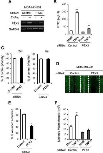 Figure 5: PTX3 knockdown reduces breast cancer cell migration and macrophages migration to cancer cells. A: Cells were transfected with either control or PTX3 targeting siRNA followed by treatment with vehicle or TNF-α and the silencing efficacy of PTX3 targeting siRNA was confirmed in MDA-MB-231 cells with RT-PCR. B: PTX3 knockdown was also validated with ELISA methods. C: Analysis of the effect of PTX3 depletion on cell proliferation in MDA-MB-231 cells. D: The effect of PTX3 silencing on MDA-MB-231 cell motility in a wound-healing experiment. MDA-MB-231 cells were transfected with either control or PTX3 targeting siRNA and imaged after wound scratching as in Figure 3. E: Wound closure effect was calculated as wound confluence gained in 24 hours. F: Effect of PTX3 silencing on migration of macrophages. MDA-MB-231 cells at the lower compartments of a transwell system were transfected with either negative control or PTX3 siRNA and then treated with vehicle or TNFα. Macrophages (1.2 × 106) were added to the upper chamber of each transwell and allowed to migrate for six hours and the number of macrophages in the lower chamber was counted. (**P < 0.005, compared to macrophage numbers in non-treated MCF-7 cells).