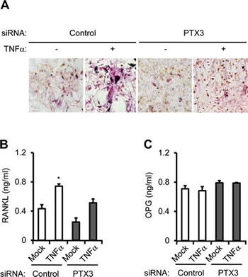 Figure 6: PTX3 knockdown in breast cancer cells reduces OC differentiation and activation. A: Involvement of PTX3 in OC differentiation and activation. Isolated pre-osteoblast cells and bone marrow cells were cultured with Vitamin D3 and PEG2 at the lower compartments of a transwell system. MDA-MB-231 cells (1.2 × 106) transfected with negative control or PTX3 siRNA followed by vehicle or TNFα treatment were added to the upper chamber of each transwell. After 7 days, OCs showing TRAP+ MNCs (> 3 nuclei) were identified by TRAP staining under a light microscope. The levels of soluble RANKL (B) and OPG (C) proteins from conditioned media of co-culture from lower compartments of transwell were determined by ELISA.