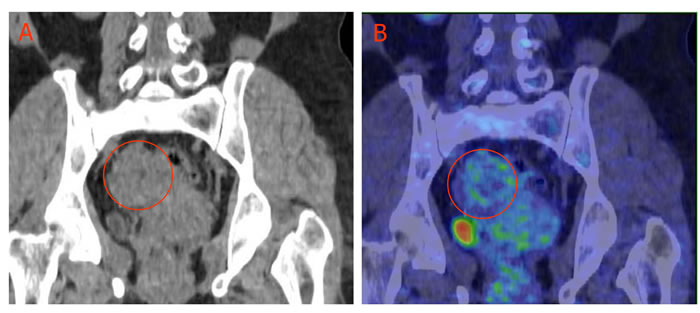 Figure 2: Low 18F-FDG uptake in ovary granulosa cell tumor. A 54-yr-old female with pathologically confirmed granulosa cell tumor of the right ovary (circled), 18F-FDG accumulation in the tumor is low. A: CT imaging; B: 18F-FDG PET/CT overlay obtained 60 min after 5 mCi (185MBq) 18F-FDG intravenous injection.