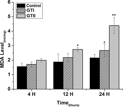 In contrast, MDA content was significantly increased at 12 h (2.74 ± 0.073, p < 0.05) and 24 h (4.39 ± 0.35, p < 0.01) in GTII treated group compared with control group. While in case of GTI infection, there was significantly increased in MDA content only at 24 h (2.62 ± 0.34, p < 0.05) in comparison with control group, but the expression was lower than the GTII group as shown in Figure 6.