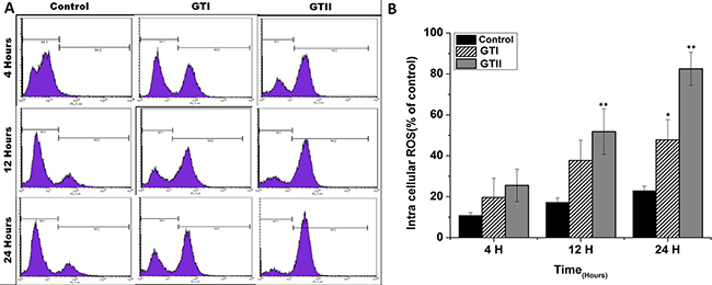 Figure 8: Comparison of ROS production in bMECs after infection of GTI and GTII by flow cytometry at 4 h, 12 h and 24 h. Results showed the means ± SD of the three independent experiments. *p < 0.05, **p < 0.01.