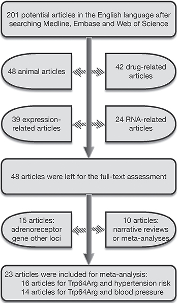 Inclusive criteria were determined by all listed authors of this study, from the following three respects: (i) study design: either retrospective or nested; (ii) genetic data: the genotype or allele distributions of ADRB3 gene Trp64Arg polymorphism between hypertensive patients and normotensive controls or the mean and standard deviation of systolic blood pressure (SBP) and diastolic blood pressure (DBP) in mmHg, and when available other related intermediate phenotypes, including BMI, fasting blood glucose (FBG), fasting insulin, total cholesterol and HDLC across Trp64Arg genotypes; (iii) the genotypes of Trp64Arg polymorphism distinguished by validated methods. Two researchers - Hualing Yang and Dongmiao Cai, independently filtrated eligible articles from all keywords- and references-indexed search results per the inclusive criteria formulated above, and they also fixed all discrepancies with consensus.