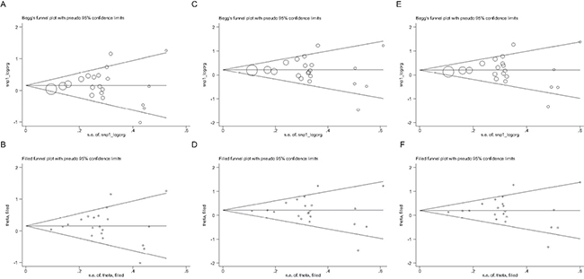 Figure 3: Begg’s and filled funnel graphs for the association of ADRB3 gene Trp64Arg polymorphism with hypertension risk under the allelic (A and B panels), heterozygote-genotypic (C and D panels) and dominant (E and F panels) models.