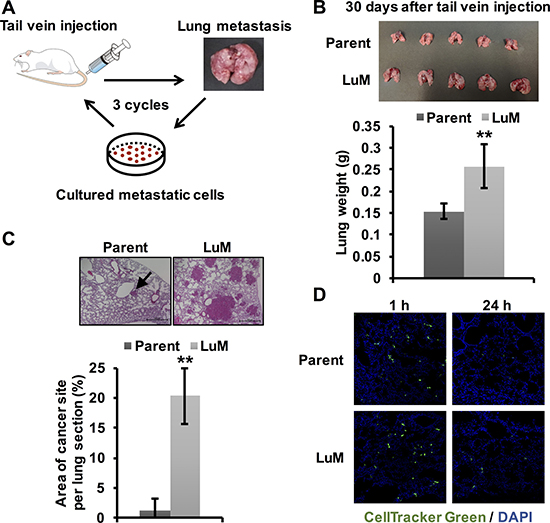 Figure 1: Generation of highly metastatic cells derived from the KYSE150 cell line. (A) The generation of highly metastatic cells derived from KYSE150, an ESCC cell line, by in vivo selection during the process of lung metastasis. The selection cycle was repeated three times. (B) Ex vivo mouse lung images and weights at 30 days after tail vein injection of parent KYSE150 cells and LuM cells (5.0 × 105 cells in 100 μl of PBS, 5 mice, respectively). Data are represented as mean ± standard deviations. **p < 0.01. (C) Hematoxylin and eosin-stained lung sections and quantification of lung metastatic foci at 30 days after tail vein injection of parent KYSE150 cells and LuM cells (5.0 × 105 cells in 100 μl of PBS, 5 mice, respectively). Scale bar, 500 μm. The arrow indicates metastatic foci. Data are represented as mean ± standard deviations. **p < 0.01. (D) Extravasation assay using immunofluorescent analysis. Cells labeled with CellTrackerTM Green were injected into the tail veins of the mice. After a defined time, the mice were sacrificed and frozen sections of the lung were prepared.