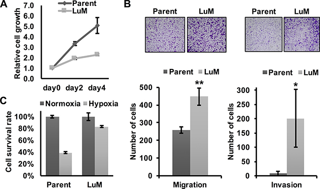 Figure 2: Characterization of the highly metastatic cell line LuM. (A) Cell growth curves were determined by crystal violet staining. Cell growth was slower in LuM cells compared with that of the parent KYSE150 cells in vitro. Data are represented as mean ± standard deviations. (B) Cell motility and invasion was assessed by a transwell migration and invasion assay with parent KYSE150 cells or LuM cells. Data are represented as mean ± standard deviations. *p < 0.05. **p < 0.01. (C) Cell survival rates were determined by crystal violet staining. Cell viability under hypoxic conditions (O2 < 0.1%, 48 h) was higher in LuM cells compared with that of parent KYSE150 cells in vitro. Data are represented as mean ± standard deviations.