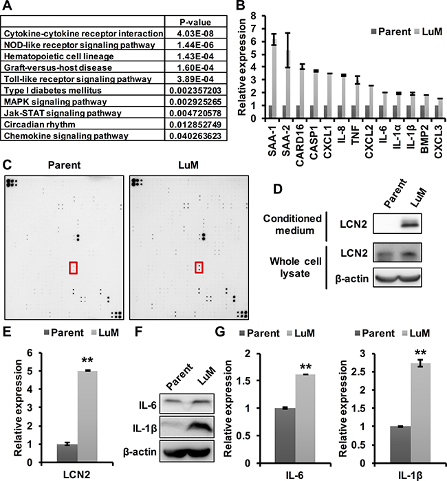Figure 3: Involvement of cytokines in the enhanced metastatic ability of LuM cells. (A) Strategy for identifying metastasis-associated genes. In the expression array analysis, 246 genes showed increased expression levels in LuM cells compared with parent KYSE150 cells. Subsequently, gene pathway enrichment analysis showed a strong association of the candidate genes with the cytokine-cytokine receptor pathways. (B) Expression levels of candidate genes by qRT-PCR. Error bars are standard deviations of the means of duplicate experiments. (C) Cytokine array analysis of the cell culture supernatant from parent KYSE150 cells or LuM cells. The red box indicates LCN2. Upper left and lower right on both membrane indicate reference spot. Information of each position on array were shown in manufacturer’s instructions. (D) LCN2 protein expression in conditioned medium and the whole cell lysate by western blotting in parent KYSE150 cells and LuM cells. (E) LCN2 secretion levels of the supernatant from parent KYSE150 cells and LuM cells by ELISA. Data are represented as mean ± standard deviations. **p < 0.01. (F) IL-6 and IL-1β protein expression in the whole cell lysate by western blotting in parent KYSE150 cells and LuM cells. (G) IL-6 and IL-1β secretion levels of the supernatant from parent KYSE150 cells and LuM cells by ELISA. Error bars are standard deviations of the means of duplicate experiments. Data are represented as mean ± standard deviations. **p < 0.01.