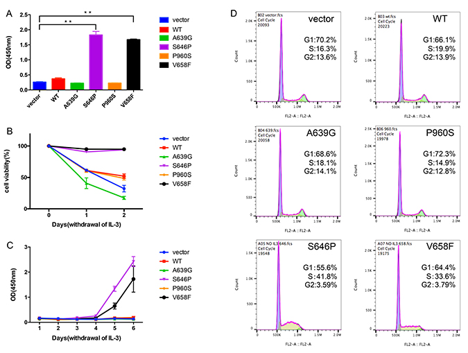 Figure 3: JAK1 S646P mutation drives IL-3-independent growth of BaF3 cells. (A) The proliferation of transduced BaF3 cells after withdrawing IL-3 for 3 days was assayed by CCK-8. Data are expressed as mean ± s.d of at least 3 independent experiments. **P < 0.01. (B) The viability of transduced BaF3 cells after withdrawing IL-3 for 48 h was determined by trypan blue exclusion method at the indicated time points. (C) The survival curves of transduced BaF3 cells cultured in the absence of IL-3 for 6 days were determined by CCK-8. (D) Cell cycle histograms of transduced BaF3 cells were assayed by flow cytometry. The proportion of G1 or S/G2 phase is expressed as percentage of total cells.
