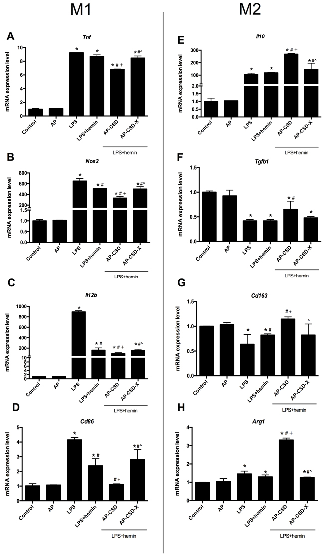 Figure 3: CSD peptides shifted alveolar macrophages polarization toward M2 phenotype. A.-D. The expression of Tnf, Nos2, Il12b and Cd86 (the markers of macrophage M1 phenotype), were detected in AMs. E.-H. The markers of macrophage M2 phenotype such as Il10, Tgfb1, Cd163 and Arg1 expression, were detected in alveolar macrophages. Values represented mean ± SD (n = 5 for each group). *, significance compared with control group (P < 0.05); #, significance compared with LPS group (P < 0.05); +, significance compared with LPS + hemin group (P < 0.05); ^, significance compared with LPS + hemin + AP-CSD group (P < 0.05).
