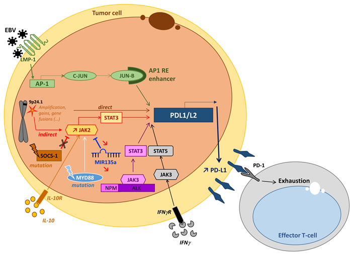 In lymphoma, PD-1 is frequently upregulated in tumor cells themselves. For example, its expression is regularly reported in peripheral T cell lymphoma (PTCL) derived from follicular helper T cells (TFH) such as angioimmunoblastic T cell lymphoma, follicular T cell lymphoma and nodal peripheral T cell lymphoma with TFH phenotype. Likewise, some neoplastic B cells (prolymphocytes/paraimmunoblasts) in chronic lymphocytic leukemia (CLL) frequently up-regulate PD-1 [28-31]. Its ligands, PD-L1 (B7-H1, CD274) and PD-L2 (B7H3, CD273), are also often expressed by the tumor cells in some B cell or T cell lymphoma (Table 1). The proliferation-reducing effect of PD-L1 blockade in different lymphoma cell lines suggests a key role for PD-1/PD-L1 expression in NHL lymphomagenesis [32]. Intracellular PD-1 signaling in effector T cells, which is activated upon binding to PD-L1 or PD-L2, reduces T cell activation signaling and inhibits efficient antitumor immune function [33]. In the microenvironment of NHL tumors, PD-1 and PD-L1 can be expressed on effector T and myeloid cells, respectively [33, 34], and participate in NHL immune escape strategies. Several mechanisms collectively referred to as intrinsic and adaptive immune resistance can account for the overexpression of PD-L1 and PD-L2 by malignant lymphoid cells. These mechanisms, schematically depicted in Figure 1, are not mutually exclusive and may co-exist in the same tumor [35-43].