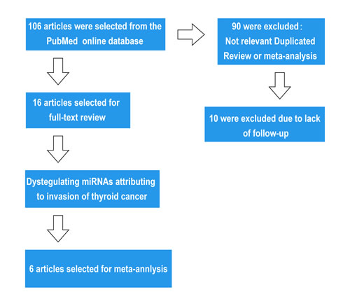 Research studies were considered to be eligible if they met the following criteria: (1) the study focused on patients with any type of papillary thyroid carcinoma; (2) the effect of the dysregulated miRNA on invasion was confirmed via analysis of the patients’ metastases or other experimental tests in the same article; (3) for meta-analysis articles, miRNA effect was confirmed through patient follow-up. Articles were excluded based on the following criteria: (1) reviews, letters, comments, or pure laboratory studies; (2) absence of specific evidence showing the dysregulated miRNA had any influence on invasion; (3) discrepant conclusions across different articles.
