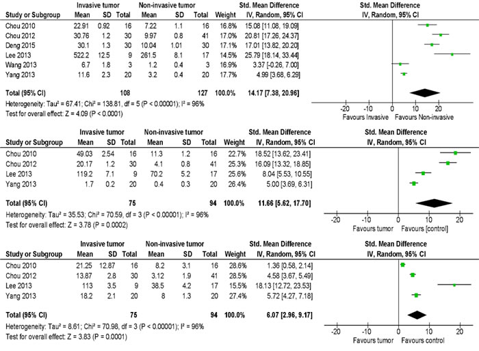 Figure 3: Forest plots for miRNA-146, miRNA-221, and miRNA-222 in the described articles. As I2 > 50%, a random-effects model was used. p < 0.05, indicated that miRNA-146, miRNA-221, and miRNA-222 were all upregulated in invasive tumors compared with paired controls.