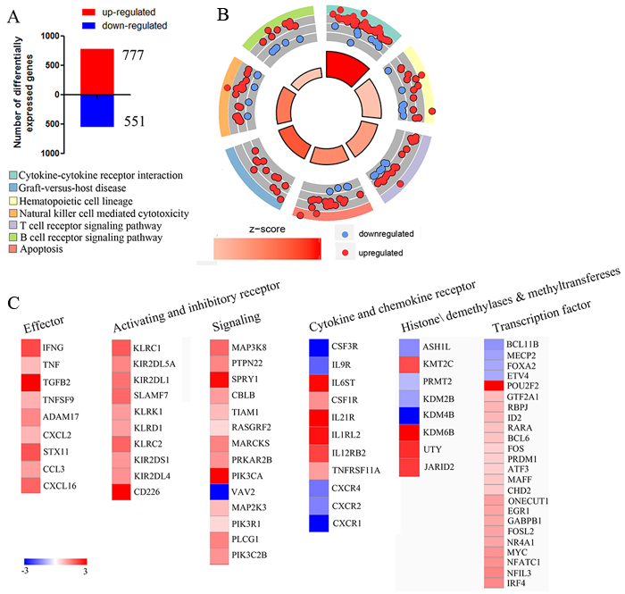 Figure 1: Gene expression profiling reveals NK cells undergo a dramatic transformation during activation. A. Microarray analysis revealed that 777 genes were upregulated (red) and 551 genes were downregulated (blue). B. Circle plot; the inner ring is a bar plot where the bar height indicates significance, and color corresponds to the z-score. Every color of the outer ring corresponds to a different, representative signaling pathway, and scatterplots display expression levels (logFC) for the genes. C. Heat map of cell surface receptors, signaling components, transcription factors, methyltransferase and demethylase as well as genes associated with NK cells effector that were significantly differentially expressed by comparing activating NK cell versus resting NK cell are plotted.