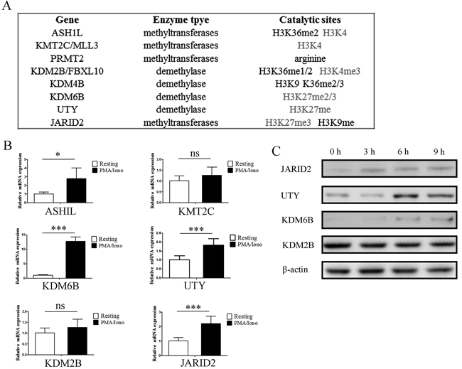 Figure 2: Gene expression of histone methytransferases and demethylases screened from microarray results were verified by qPCR and western blot. A. The substrate specificities of the indicated enzymes. B. Verification of the microarray results by qPCR analysis of the indicated genes in NK92MI cells. Results are represented as fold change over control with glyceraldehyde 3-phosphate dehydrogenase (GAPDH) as a negative control. Error bars represent mean ± SD for three independent experiments (*p < 0.05, ***p < 0.01, and two-tailed unpaired t test). NK92MI cells were stimulated with PMA plus Ionomycin for 6 h. C. Verification of the microarray results by western blot of the indicated genes in NK92MI cells. NK92MI cells were stimulated with PMA plus Ionomycin for indicated time points.