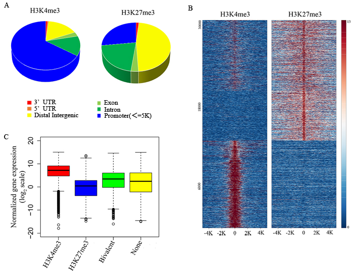 To understand the relationship between gene expression pattern and each type of modification, the data from H3K4me3 and H3K27me3 groups were then analyzed to find the overlapping DNA sequences that localized to gene promoters, and these promoters were considered to be the targets of histone modification. The corresponding genes to these promoters were then overlapped with the microarray data, and we found that the H3K4me3 marked gene groups displayed a high gene expression level, whereas H3K27me3 marked gene groups displayed a low gene expression level (Figure 3C). At the same time, all bivalent marked gene groups indicated low or non-expressing genes (Figure 3C). Therefore, the histone modification states are significantly correlated with gene expression levels.