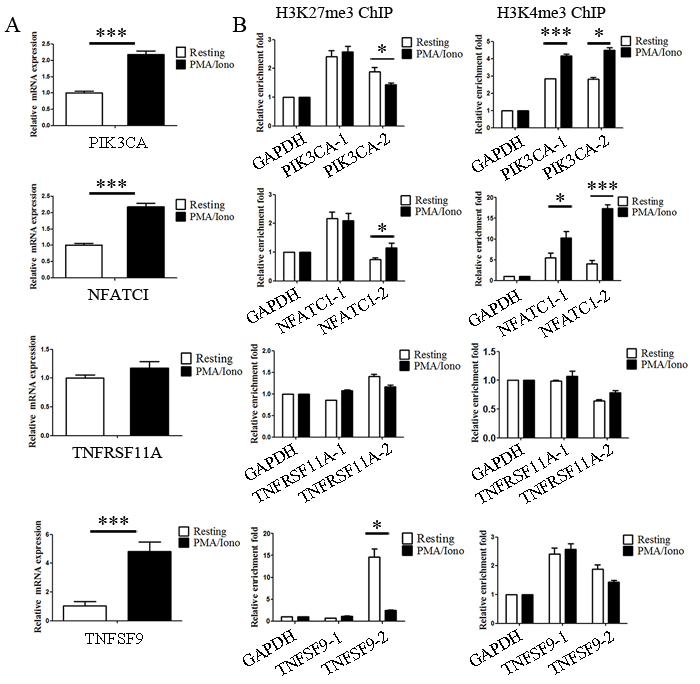 Activation of NK cells induced the expression of several histone methyltransferases and demethylases that relate to dynamic bivalent modification and transcriptional activation. In addition, we noticed that the expression of some genes critical for immune functions were upregulated in our microarray analysis. In light of the previous data, we hypothesized that these upregulated genes are the result of dynamic bivalent modification. In our experiments, quantitative PCR (qPCR) analysis was first performed to detect the expression level of PIK3CA, NFATC1, TNFRSF11A and TNFSF9, and the increased expression levels of PIK3CA, NFATC1 and TNFSF9 were verified to be consistent with the microarray results (Figure 5A). Then, to validate the ChIP-seq results, quantitative ChIP (qChIP) analysis in NK92MI cells using specific antibodies against H3K27me3 and H3K4me3 on selected genes including PIK3CA, NFATC1, TNFRSF11A and TNFSF9 was carried out, and showed a strong enrichment of H3K27me3 and H3K4me3 on the promoters, especially for H3K4me3 modification on the NFATC1 promotor and H3K27me3 modification on the TNFSF9 promotor (Figure 5B). Activation of NK cells resulted in a reduction of the H3K27me3 levels at the promoters of PIK3CA and TNFSF9 and a marked increase of the H3K4me3 levels at the promoters of PIK3CA and NFATC1 (Figure 5C). These data indicate that NK cell activation altered bivalent modification resulting in the increased expression of genes associated with immune activation.