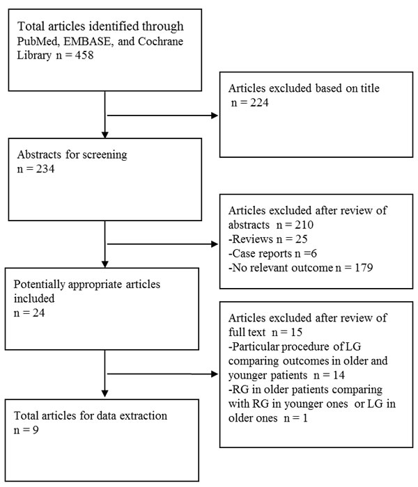 Initially, we identified 458 articles upon literature survey in three databases, PubMed, EMBASE and Cochrane library (Figure 1). Next, 434 articles were excluded after title and abstract screening using the exclusion criteria. Further, 14 articles comparing outcomes in older and younger patients regarding a particular procedure of LG were also excluded (Supplementary Table 1) [9-22]. Another article that compared robotic gastrectomy for elderly gastric cancer patients with robotic gastrectomy in younger patients or laparoscopic gastrectomy in the elderly was also excluded [33]. Finally, nine studies were selected for further meta-analysis [23-31]. Two of the nine studies compared data of a particular procedure of LG in older and younger patients (Supplementary Table 1) [30-31].