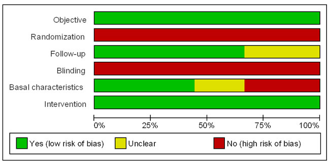 Figure 2: Analysis of risk of bias of each included study. Green color denotes studies with low risk of bias; red color denotes studies with high risk of bias; yellow color denotes studies with insufficient information for assessing risk of bias.