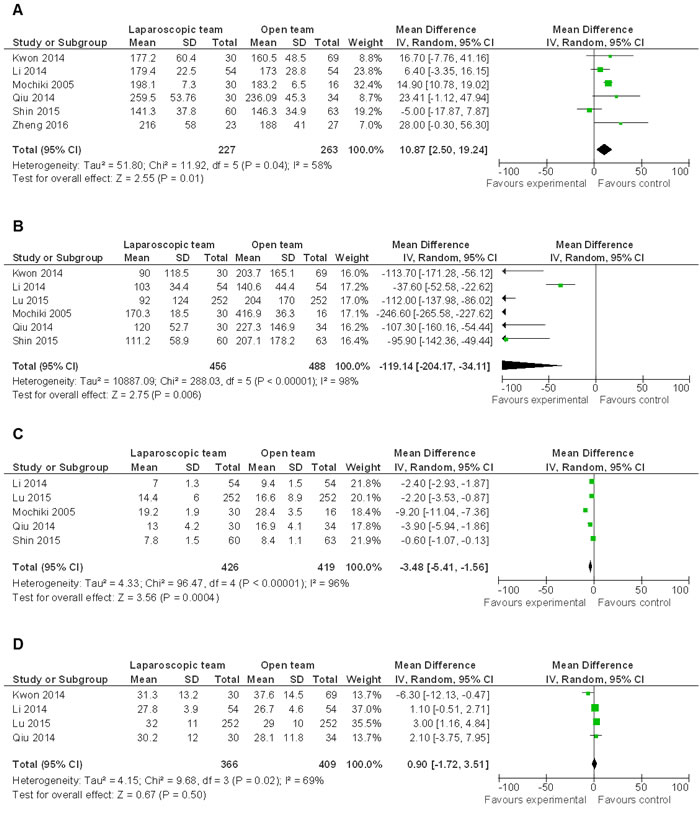 Figure 4: Comparison of general parameters related to LG and OG. A.-C. Random effect meta-analysis shows more operation time low blood loss and less hospital stay in LG. D. Random effect meta-analysis shows no difference in lymph node harvest between the two groups.