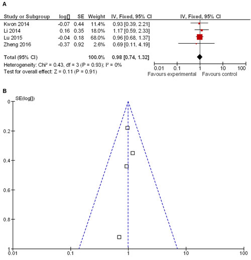 Figure 6: Overall survival rates in LG and OG groups of patients. A. Meta-analysis shows that overall survival rates are similar for both LG and OG groups. B. Funnel plot shows that no heterogeneity exists among four included studies.